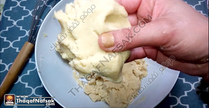 نقوم بعجن المزيج باليد حتى يمزج بشكل جيد مع السكر والزبدة والبيض وتصبح عجينة متماسكة ولينة .