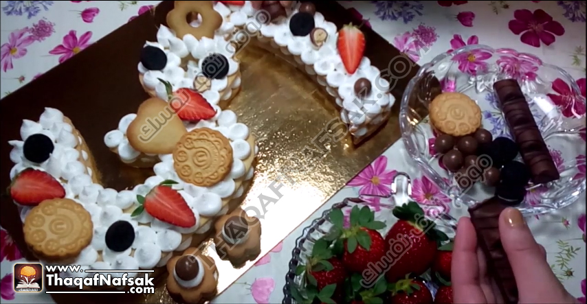 بعد ذلك نقوم بتزينها بإستخدام الفروالة والبسكويت والشيكولاتة على حسب الرغبة .