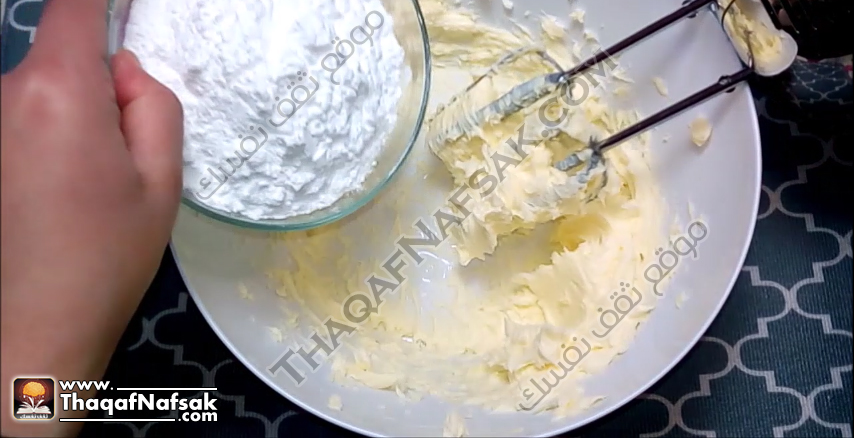 بعد ذلك نقوم بإضافة كوب سكر البودر إلى الزبدة ونضربها جيدا .