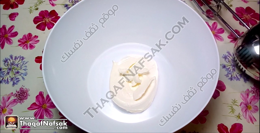 نقوم بتحضير الكريمة عن طريق وضع كوب من الجبن الكريمي في بولة غويطة ونضربها بشكل جيد ثم نضيف نصف كوب سكر بودر .