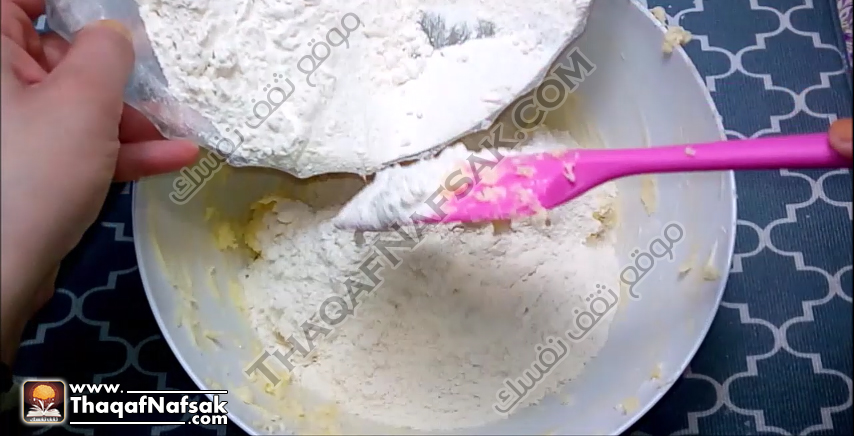 بعد تجانس المزيج نقوم بإضافة 3 أكواب دقيق منخول مع رشة الملح بشكل تدريجي .