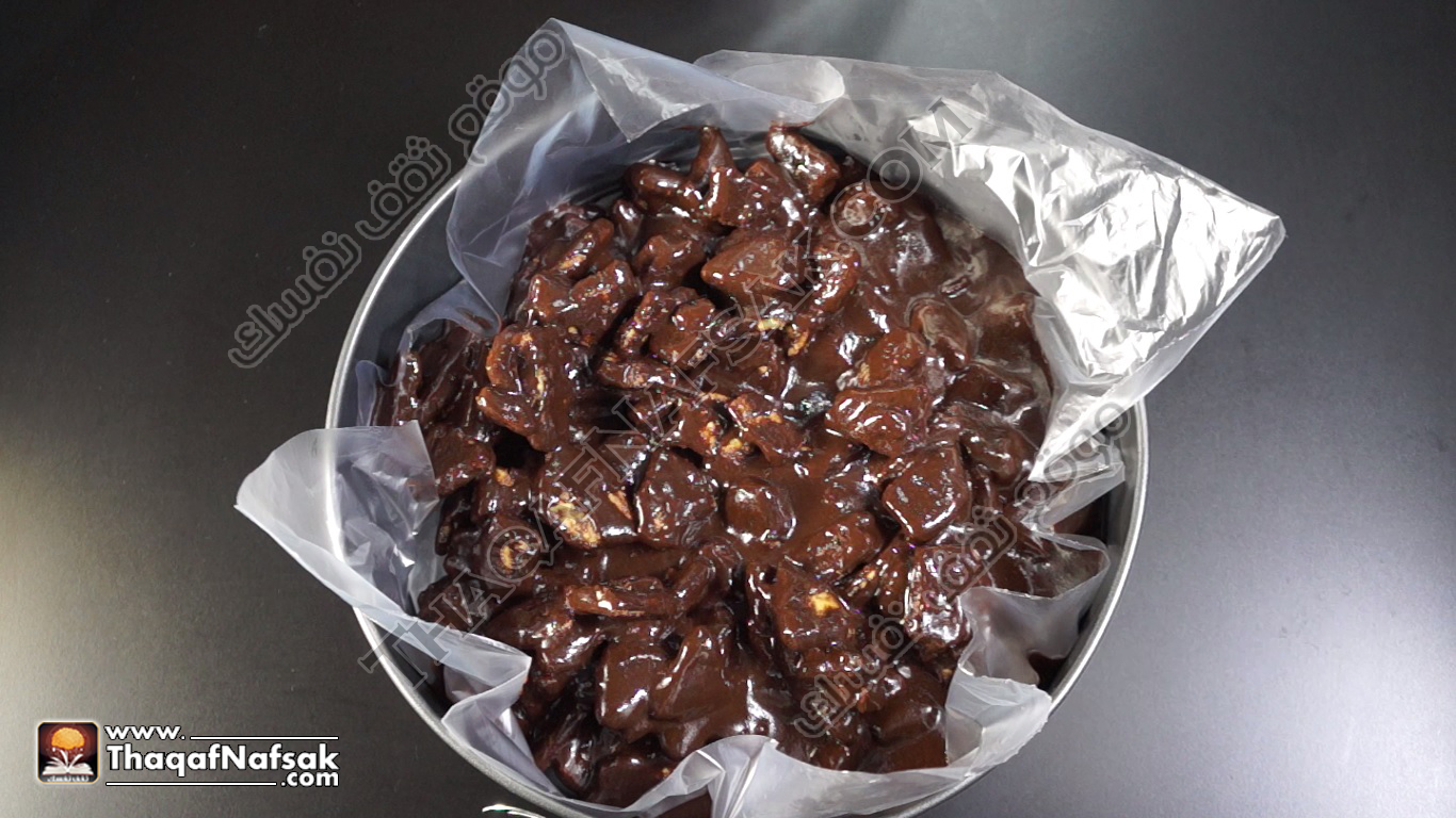 - نصب خليط البسكويت في القالب ونساويه جيدا .