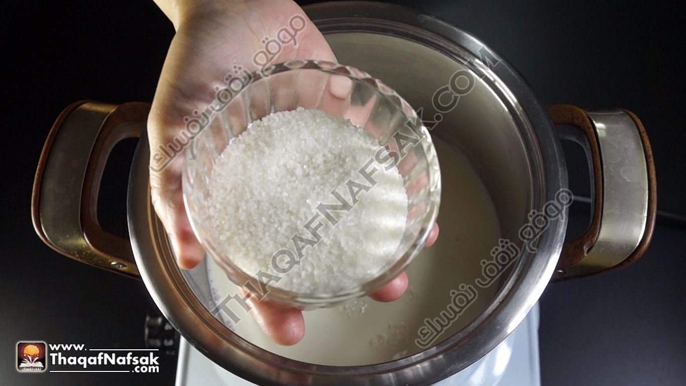 - وبعد إضافة السكر إلى الحليب نقوم بإضافة الكاكاو .