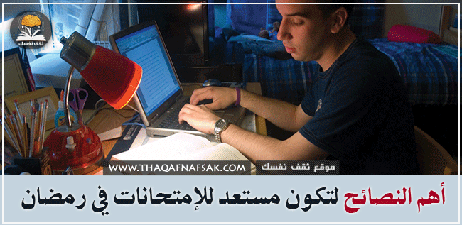 يحتفل المسلمون في جميع أنحاء العالم بقدوم شهر رمضان المبارك كل عام. و هذا العام هناك العديد من الطلاب لديهم بعض الإمتحانات خلال شهر رمضان. و بسبب الصيام قد يشعر بعض الطلاب بالتعب و الإرهاق، لذلك سنقدم لكم بعض النصائح للإستعداد للإمتحانات خلال شهر رمضان.