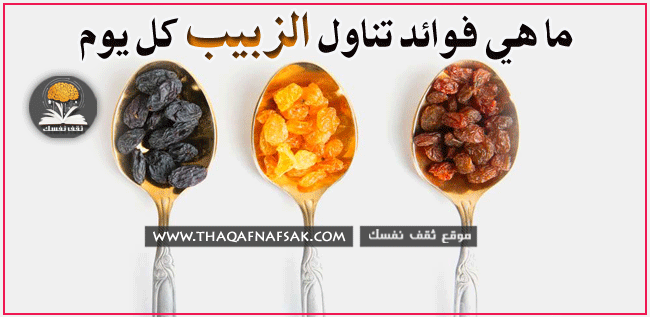 تناول الزبيب يعتبر بديل صحي للوجبات الخفيفة غير الصحية. فهي لا تمنحك فقط العناصر الغذائية المطلوبة ، بل يمكن استخدامها كوجبات في المواد الغذائية ، لتعزيز نكهة الوصفة ومنحك المكافأة الغذائية، وقد يكون من الصعب تخيل أن الزبيب الصغير يوفر الراحة من مجموعة من المشاكل الصحية ، وفي الوقت نفسه يوفر لك مصدرًا جيدًا للكربوهيدرات ، مما يضخ الجسم بالطاقة ،الزبيب غني بفيتامين ب ، وفيتامين ج ، وحمض الفوليك ، والحديد ، والكاروتين، واللوتين ، والبوتاسيوم ، والكالسيوم والمغنيسيوم .