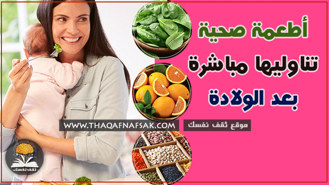 ماذا يجب أن تأكلين بعد الولادة ؟ أطعمة بعد الولادة مهمة يجب على المرأة تناولها لتسترد صحتها ولتكون جاهزة للرضاعه وتحمل طفلها و مولودها الجديد . أن الحمل والولادة يستنزفان الكثير من الطاقة والمغذيات من جسمك وأنت بالتأكيد لا تريدين أن تصابي بالمرض مباشرة بعد ولادة طفلك واذا كنتي تنوين ارضاع طفلك رضاعة طبيعية فأنت بحاجة الي ختيار أكثر الأطعمة صحية للحفاظ على صحتك وحيويتك لأمداد جسمك وطفلك بالمعادن والفيتامينات الهامة لصحتكما.