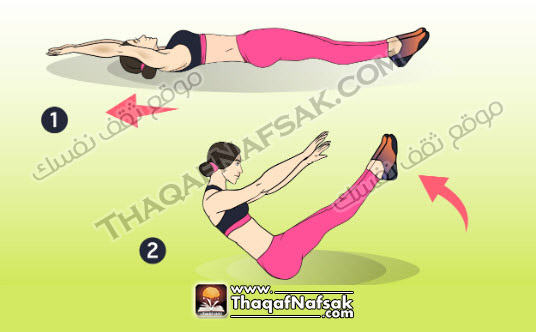 الإستلقاء علي الأرض مع رفع الجزء العلوي من الجسم بعيداً عن الأرض وثبيت اليدين بجانبك مع إمالة الظهر قليلاً إلي الوراء  .بعد ذلك، العمل علي رفع الساقين أمامك ورفع الذراعين بعيداً عن الأرض بالقرب من الركبتين والبقاء في هذه الوضعية لمدة 2 ثانية قبل العودة إلي وضعية البداية .