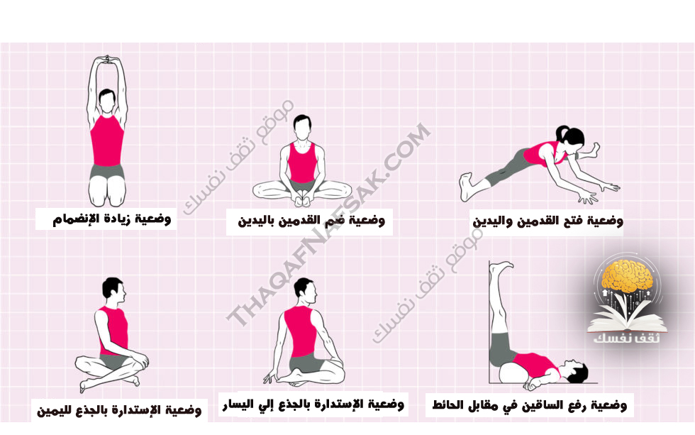 ٥- وضعية المركب : تحتاج هذه الوضعية المزيد من المرونة ويبدا من خلال الجلوس علي الأرض وثني الركبة لإتخاذ زاوية 90 درجة ويفضل الجلوس علي حصيرة التمارين حتي تكون قدميك علي الأرض ثم محاولة رفع القدمين وتحقيق تمدد القدمين حتي تكون موازية للأرض والإستمرار في رفعها لكي تحقق إستقامة العمود الفقري أثناء تمدد الركبتين أمامك لأعلي ومحاولة لمس الركبتين باليدين لتحقيق إستقامة الذراعين أيضاً والعد لمدة 10 ثوان والتكرار .
