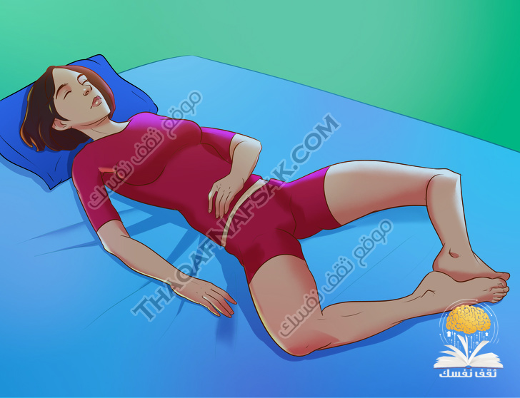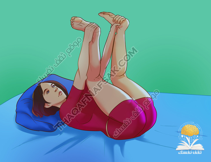 - أثناء الإستلقاء على ظهرك، قم بالزفير و إثني ركبتيك، و إجعل كعبك قريباً من الحوض.