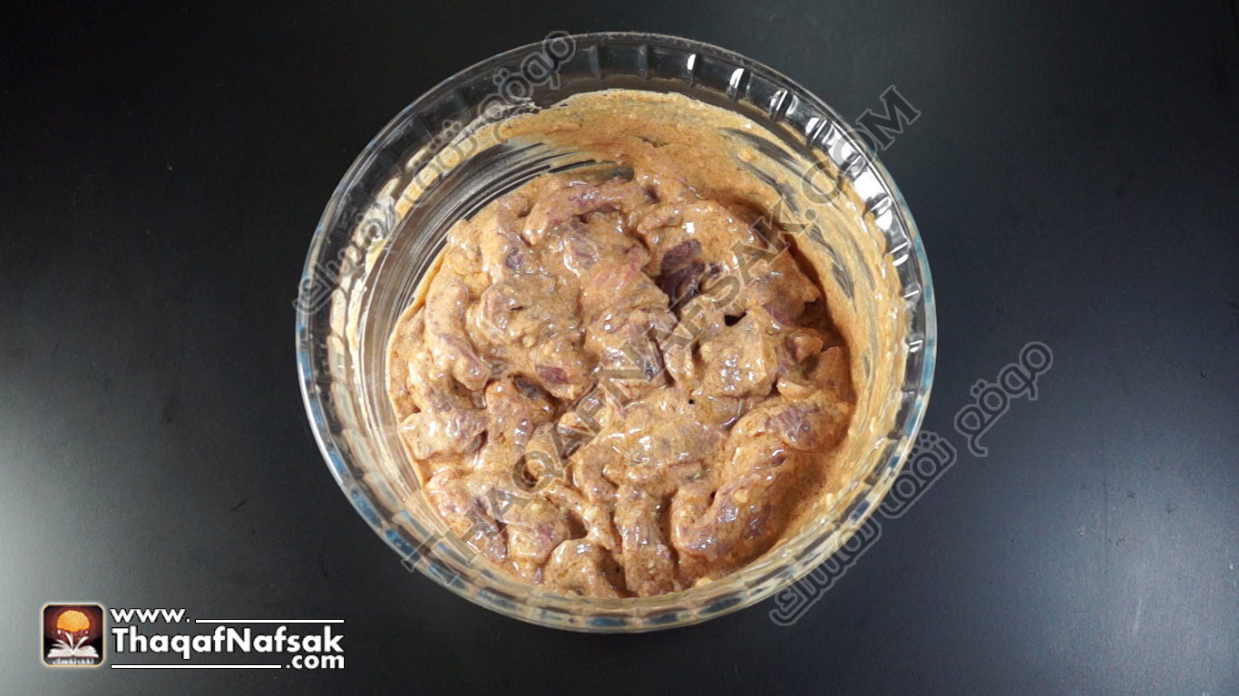 يتم تقليب اللحم في خليط الزبادي بشكل جيد .