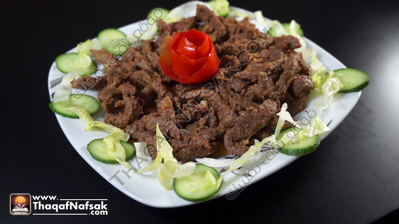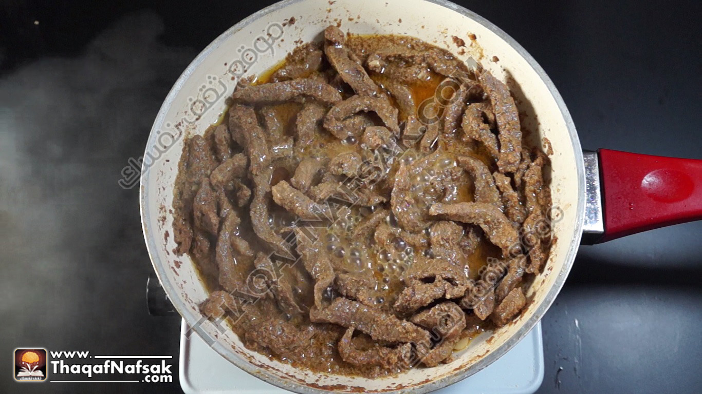 في طاسة متوسطة الحجم يوضع الزيت في الطاسة ويترك دقيقة حتى يسخن ثم نضيف شرائح اللحم في الطاسة الساخنة ونقلبها بهدوء .
