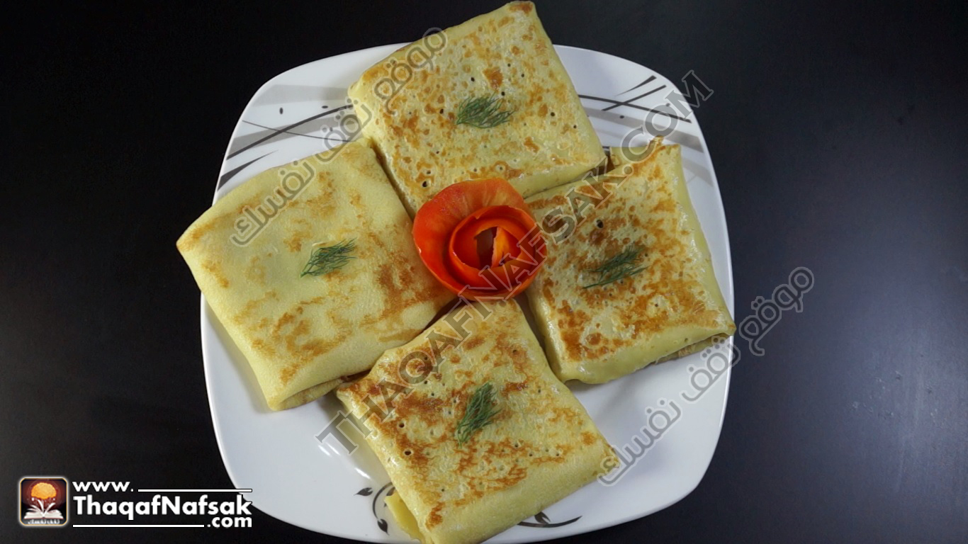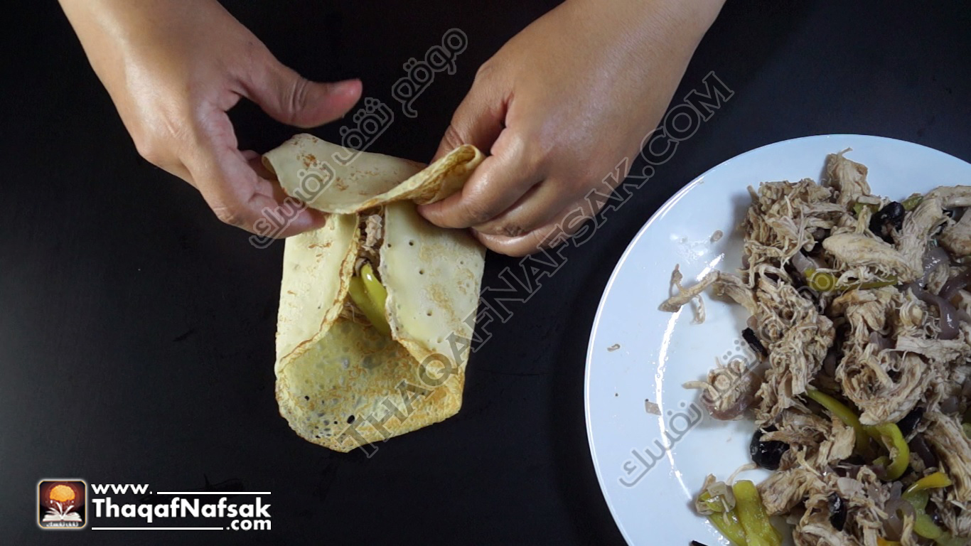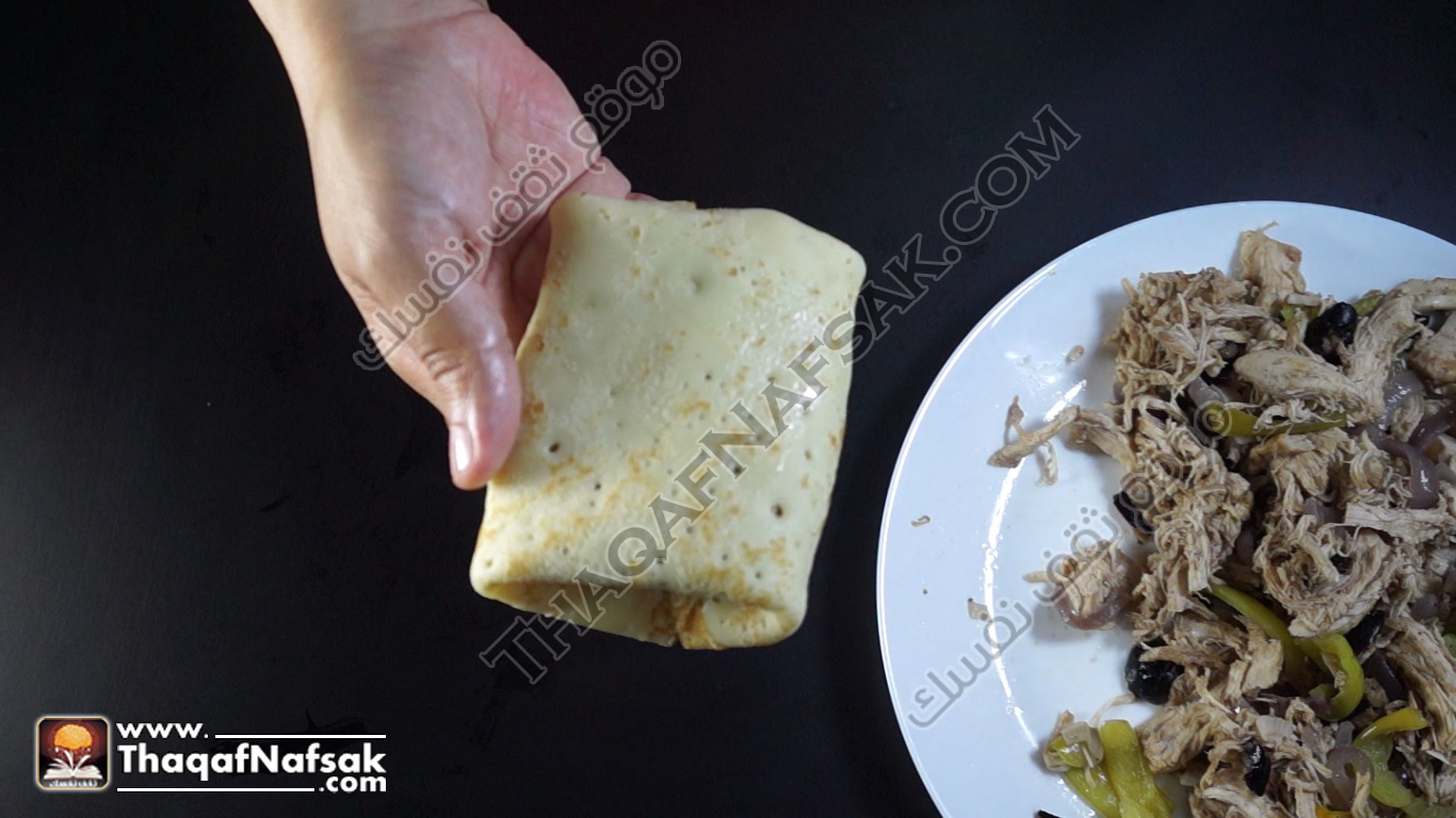 • نأخد طبقة من الكريب ونضع الحشو في المنتصف .