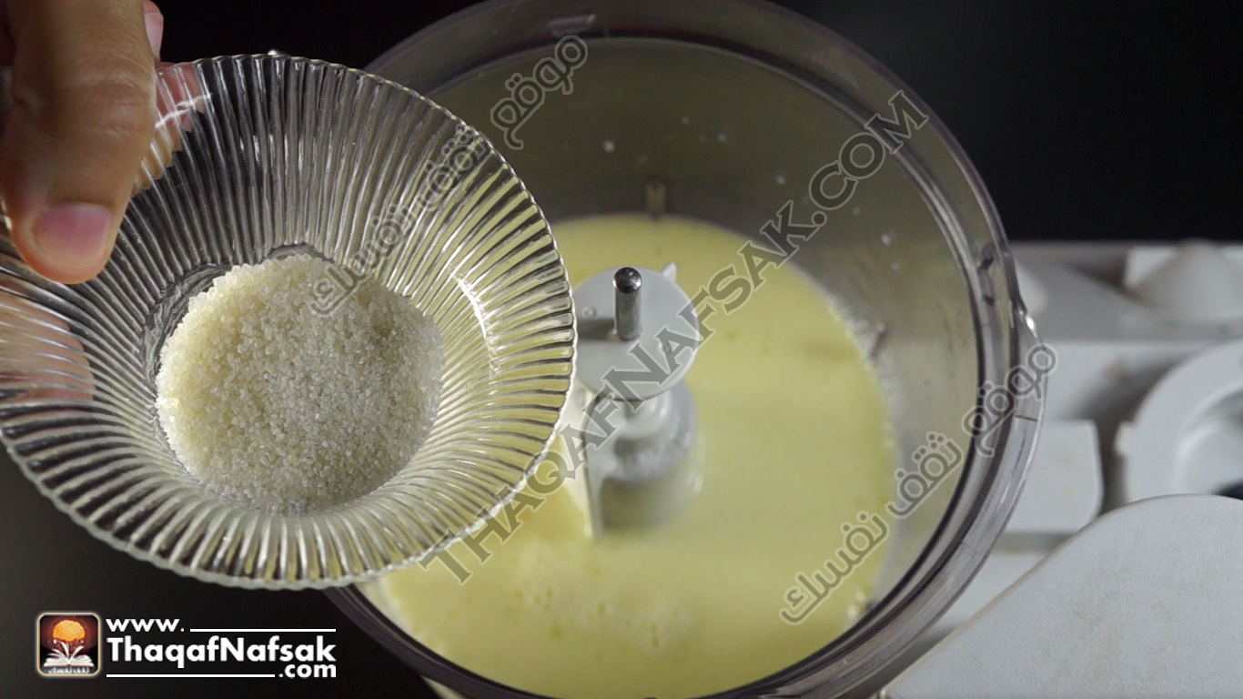 • ثم نقوم بإضافة السكر إلى الخليط ونضرب جيدا .