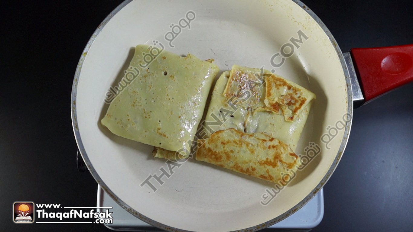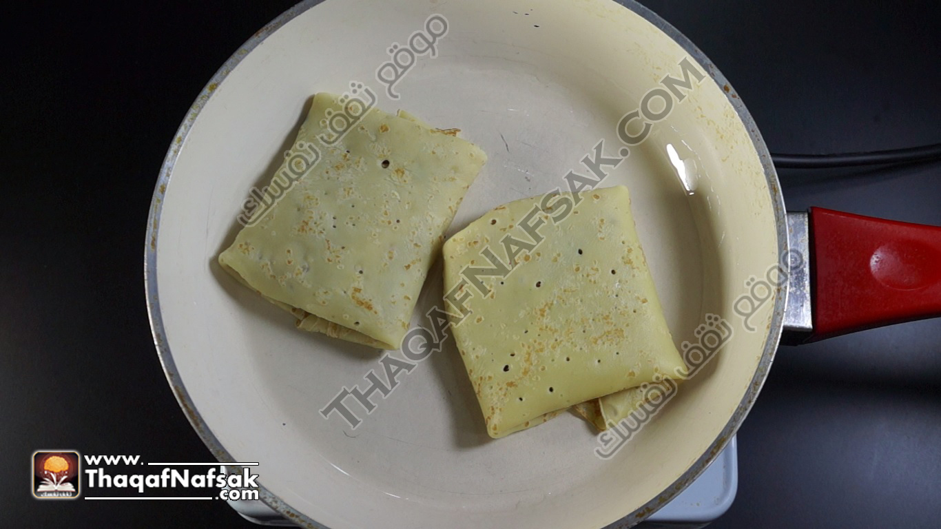 • في مقلاة على النار ندهن قليلا من الزيت بفرشاة ثم نضع مربعات الكريب ( يجب ان يكون الجزء المفتوح الى الأسفل ) .