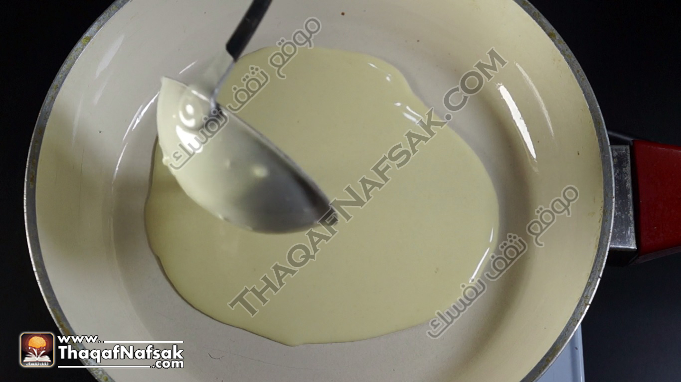 • ثم نضع جزء من العجينة السائلة في وسط المقلاه .