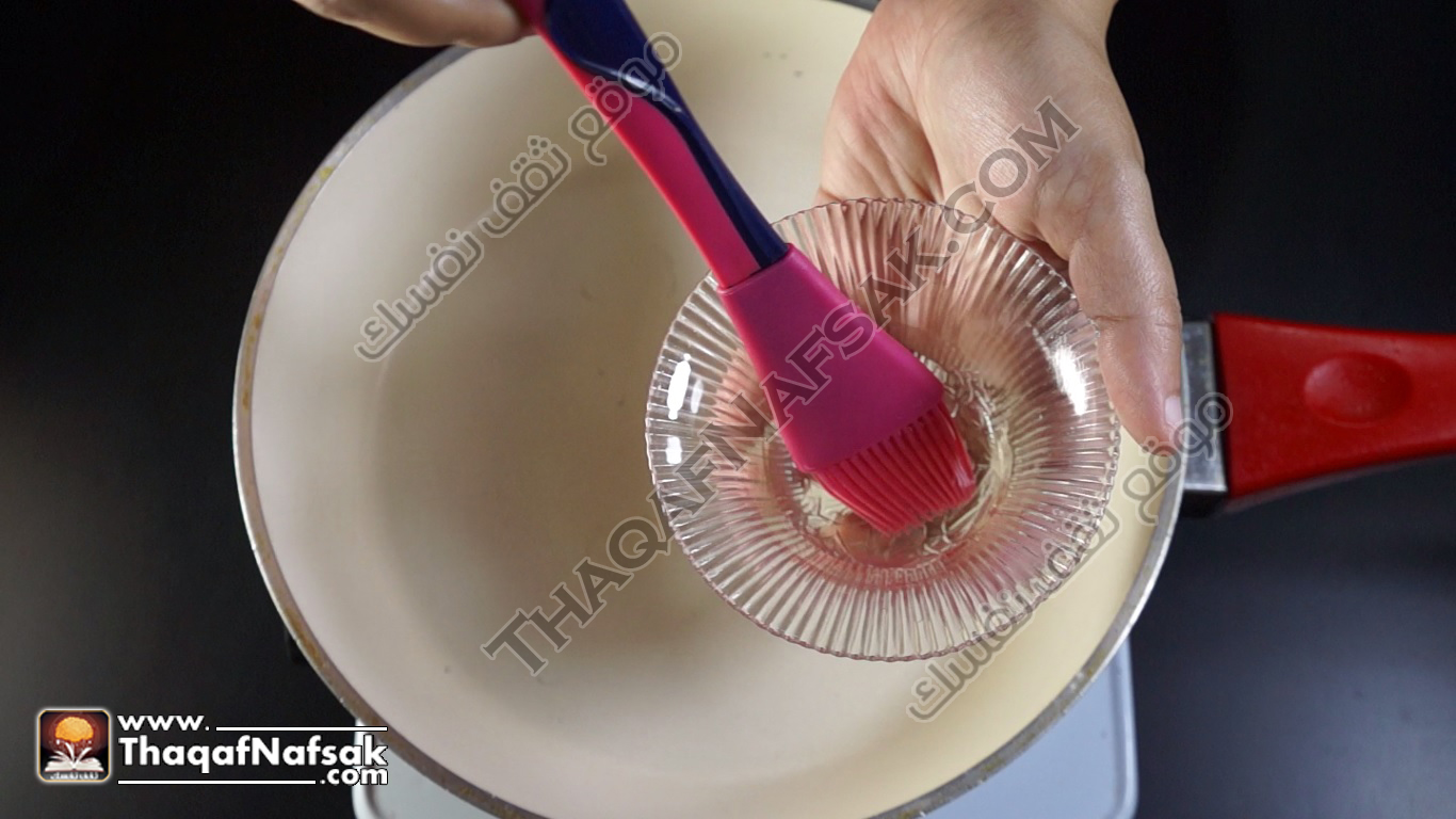 • نستخدم مقلاة غير لاصقة وندهنها قليلا من الزيت بالفرشاة ونتركها حتي تسخن قليلا .