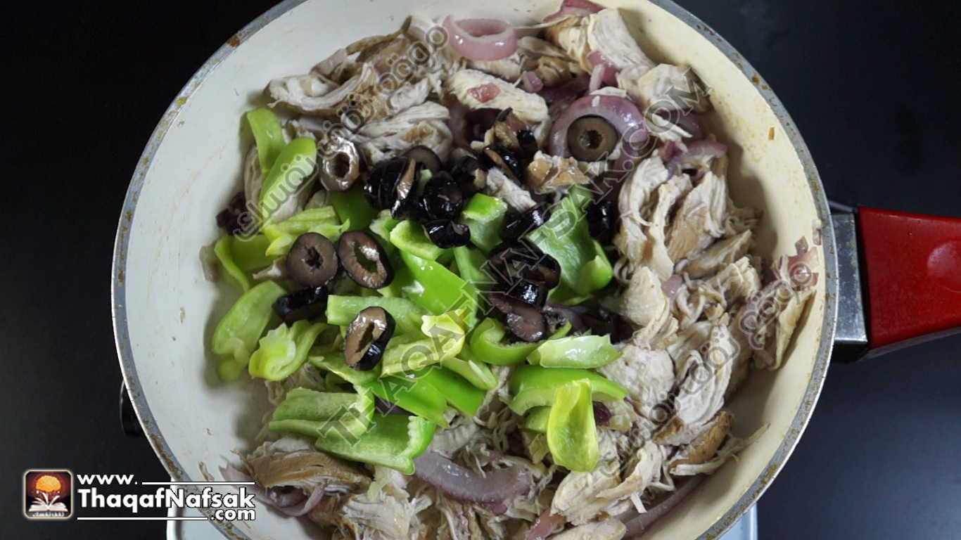 • نضيف الدجاج المسلوق ثم الفلفل والزيتون وملح وبهارات مشكلة .