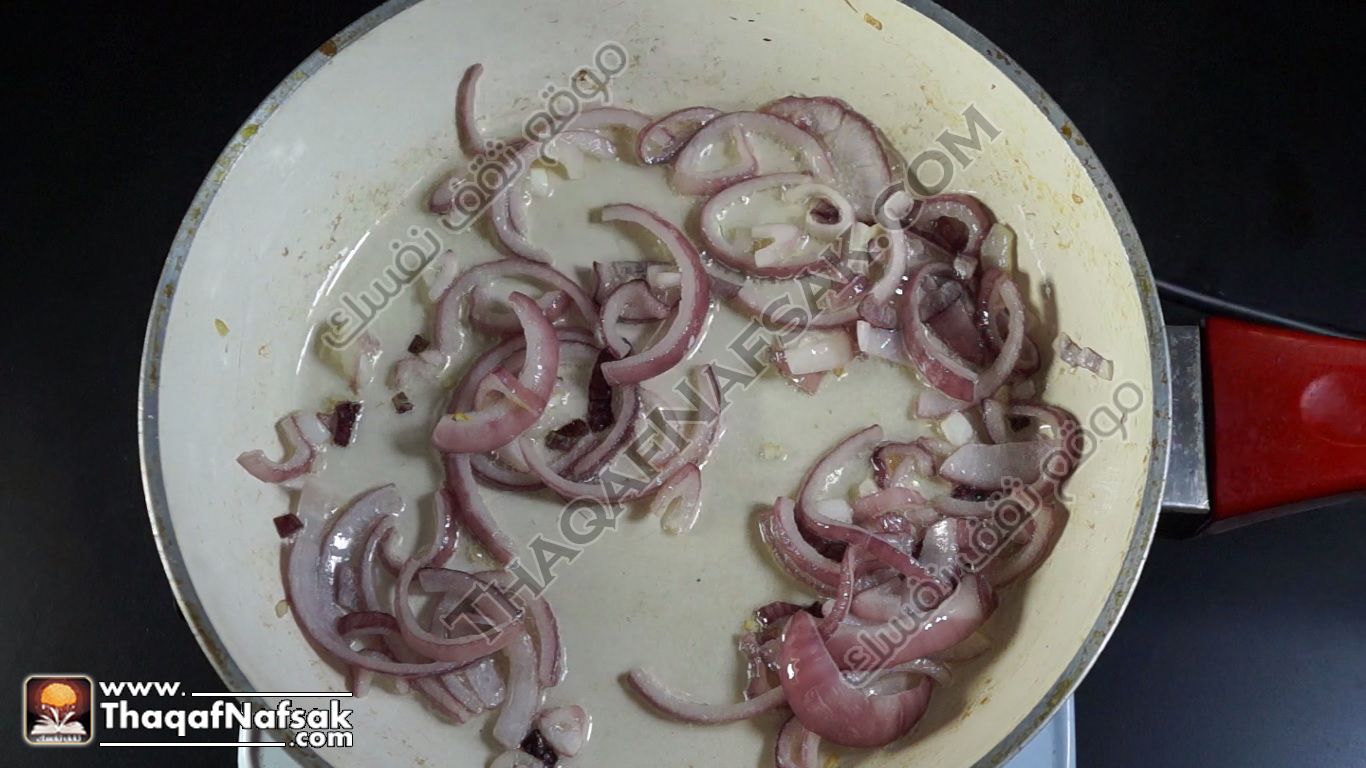 • نضع الزيت في اناء على النار ثم نضع البصل ونقلب الى ان يصبح لون البصل اصفر قليلا .