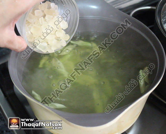 - قم بوضع قطع عشبة الليمون في وعاء به 1 لتر من الماء. ثم ضع الوعاء فوق النار العالية. و بمجرد ان يغلي قم بتقليل النار و جعلها هادئة حتى ينضج. ثم بعد ذلك قم بإضافة السكر النبات.