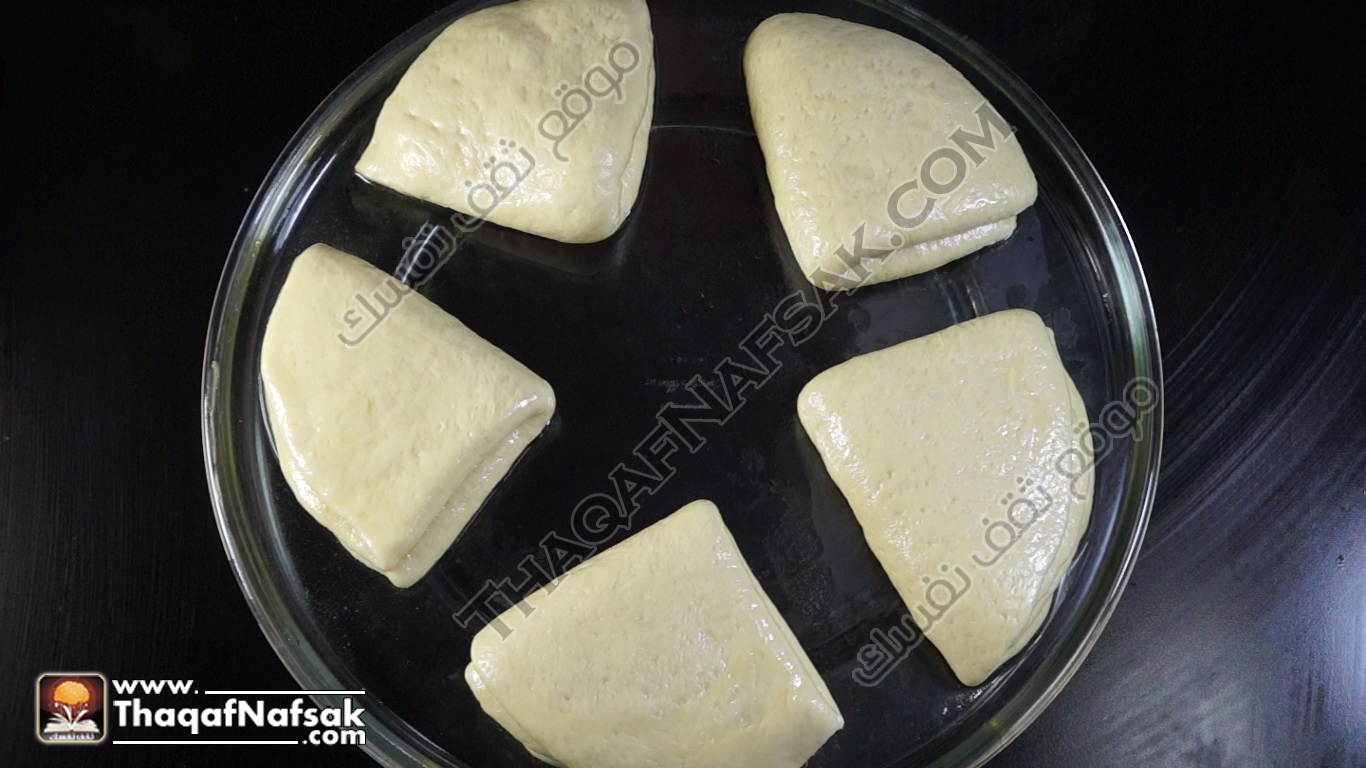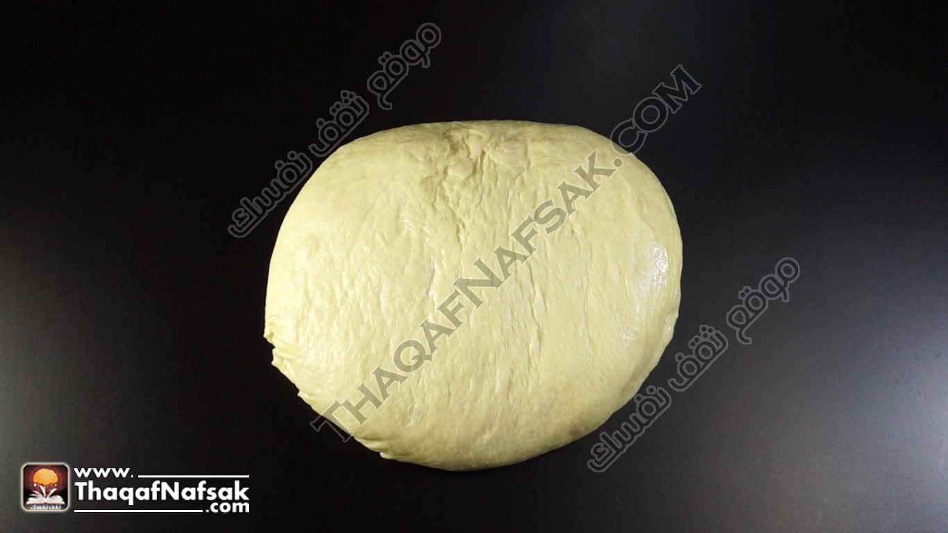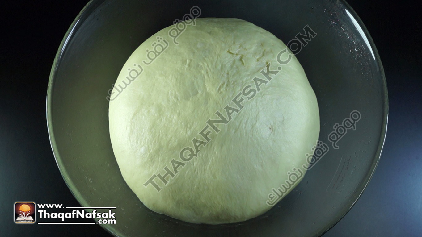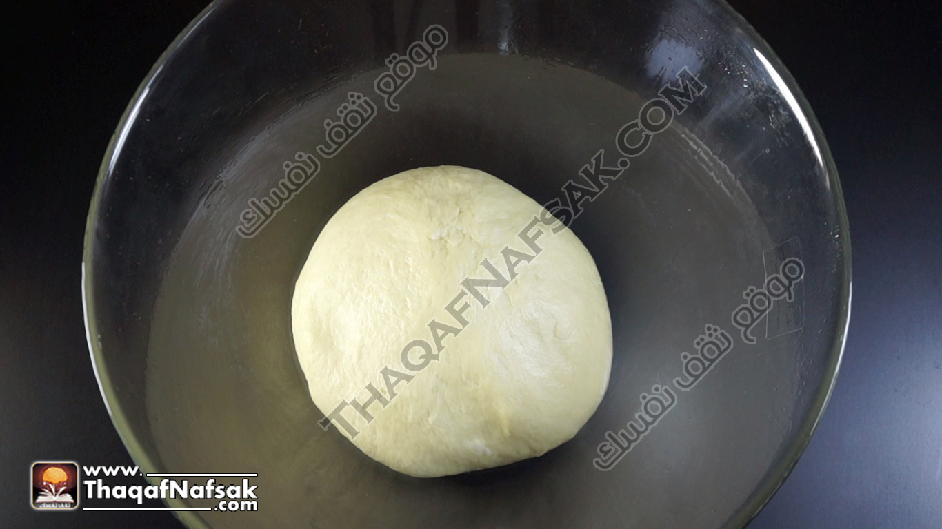 - في إناء مدهون بالزيت نضع العجينة ونغطيها بفوطة نظيفة ثم نتركها لمدة ساعة لتخمر في مكان دافئ .