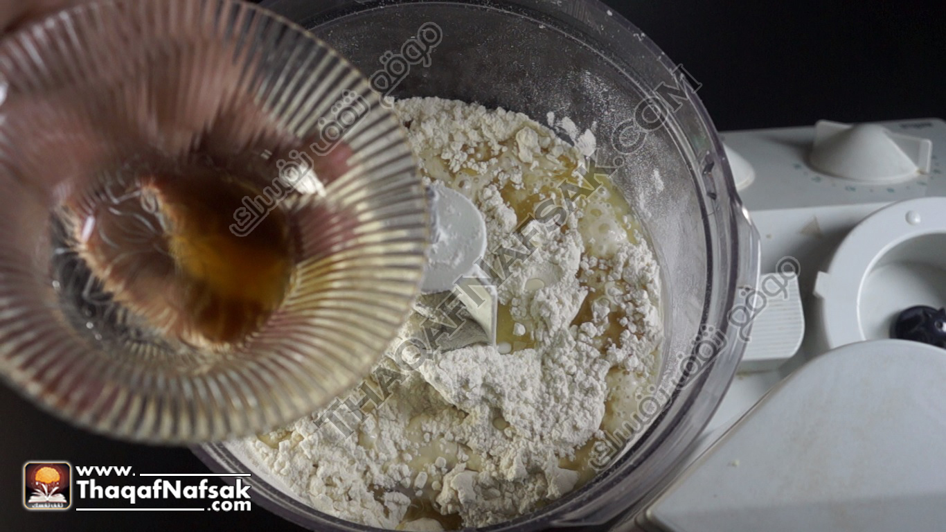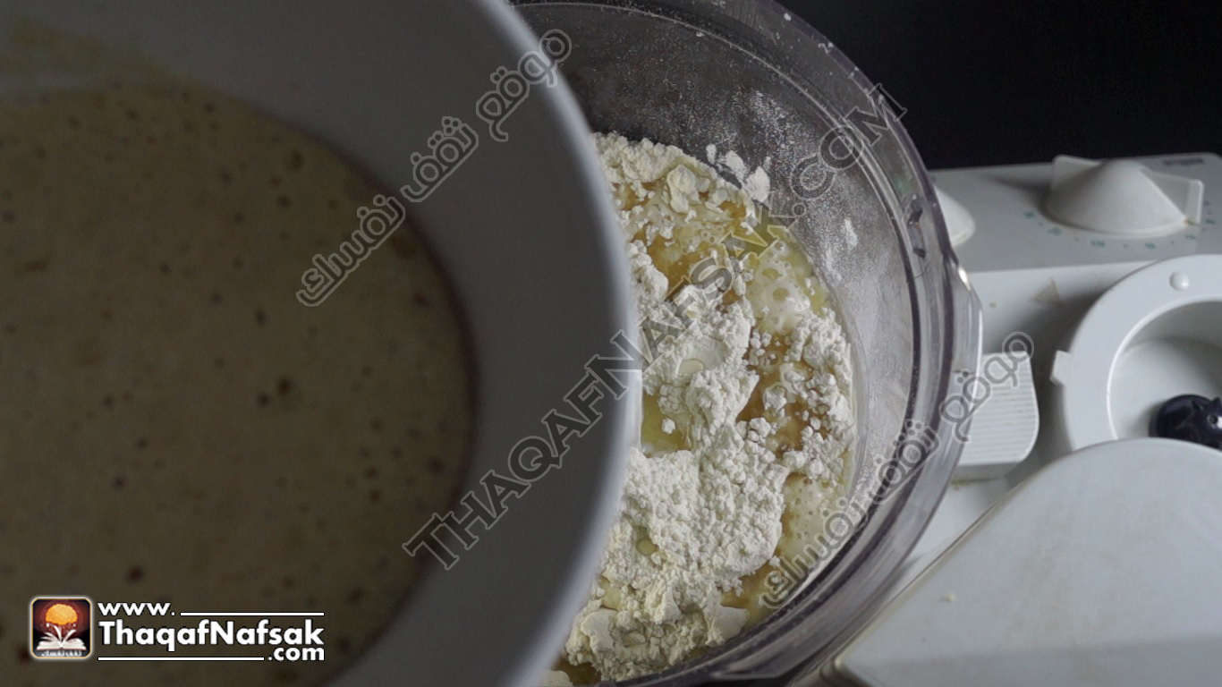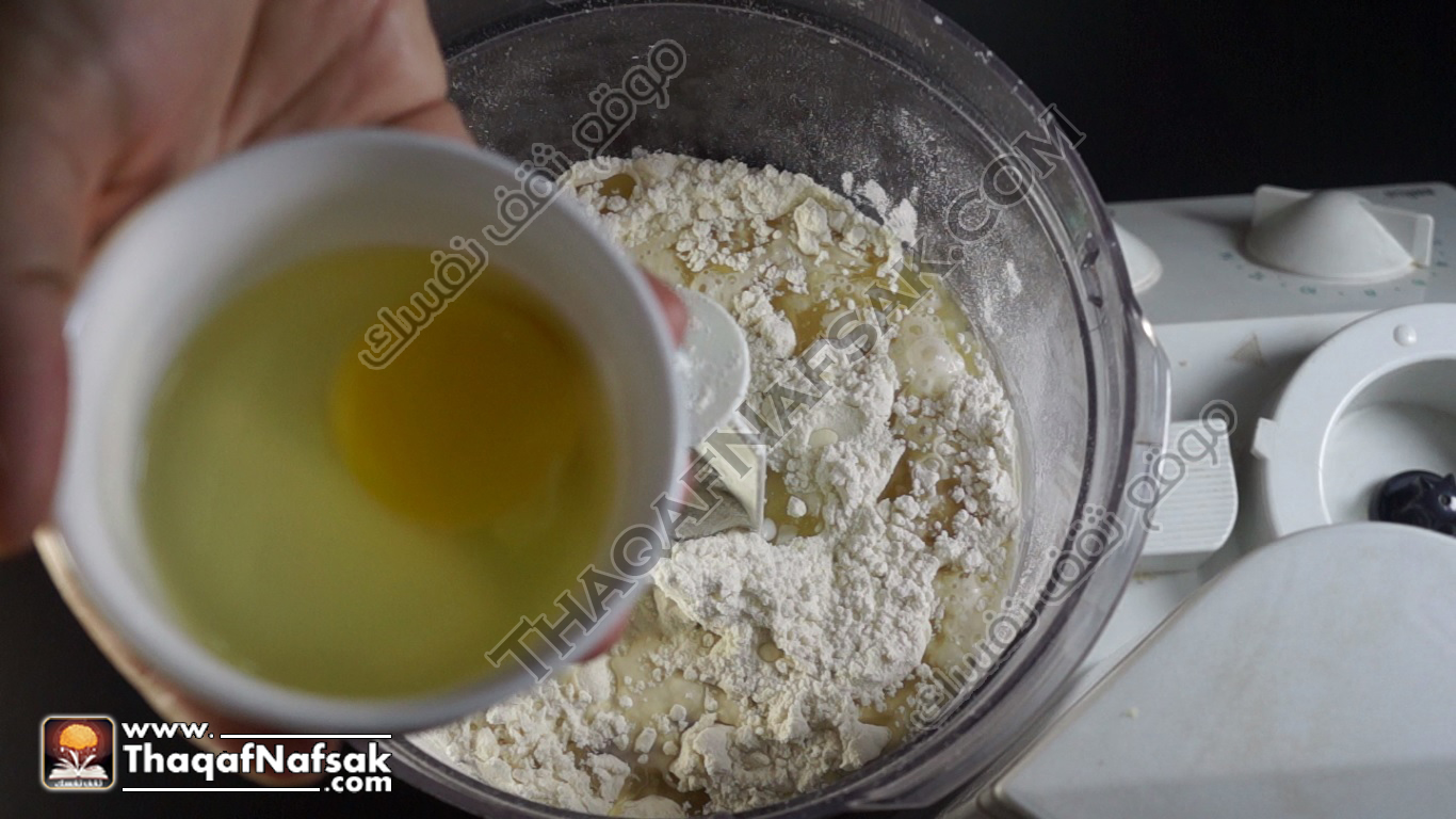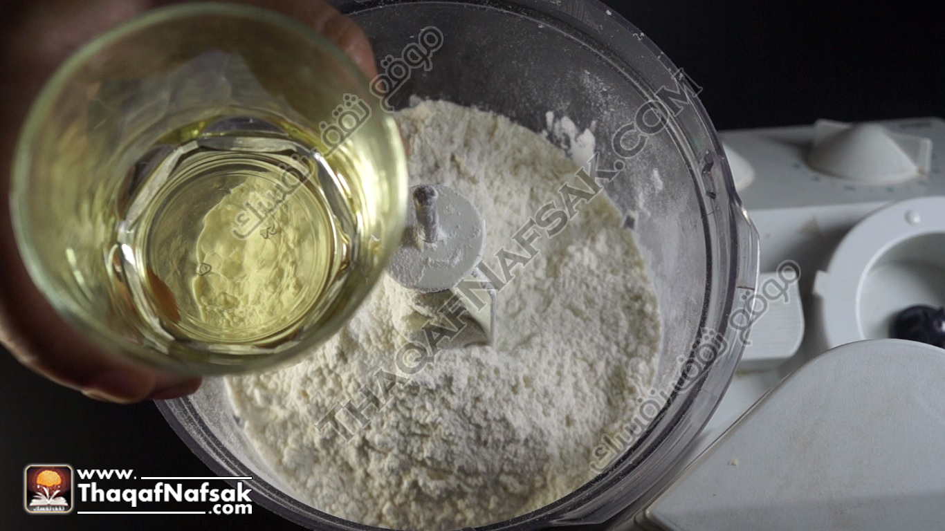 - ثم نضع الزيت إلى الملح والدقيق في العجان .