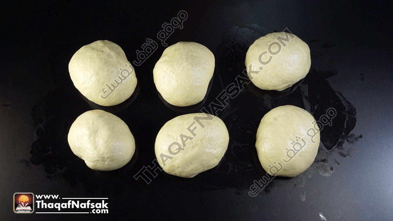- بعد أن تخمر العجينة نقوم بتقسيمها إلى ست كرات متساوية .