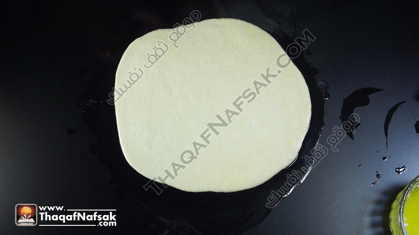 - نفرد الكرة على شكل دائري ثم ندهنها بالزبدة .