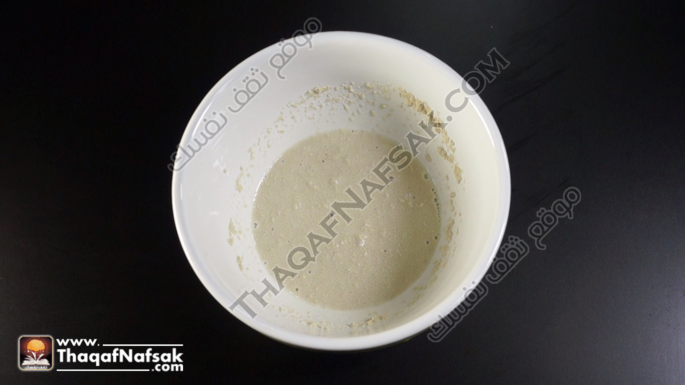 - بعد ذلك نقوم بإضافة نصف كوب من الحليب الدافئ إلى الخميرة والسكر .