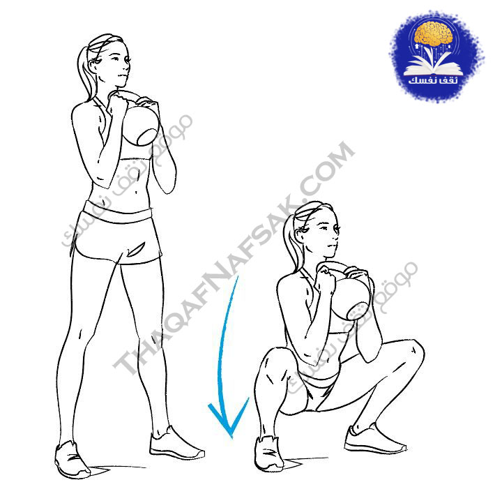 إمسك الكيتل بيل بكلتا يديك و إجلس في وضع القرفصاء حتى يلمس مرفقيك كلتا ركبتيك. حاول الوصول إلى 3 مجموعات من هذا التمرين و كل مجموعة من 15 مرة ( حافظ على دقيقة واحدة من الراحة بين المجموعات). هذا التمرين الرائع يساعد على تقوية العضلات الرباعية في الفخذ، و العضلات الوترية و عضلات البطن و عضلات أسفل الظهر.