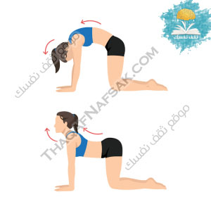 - قومي بنشر أصابعك على الأرض واضغطي على الأرض، ازفري وقومي بتدوير ظهرك مثل القطة، مع الحفاظ على ركبتيك وكتفيك في مكانهما.