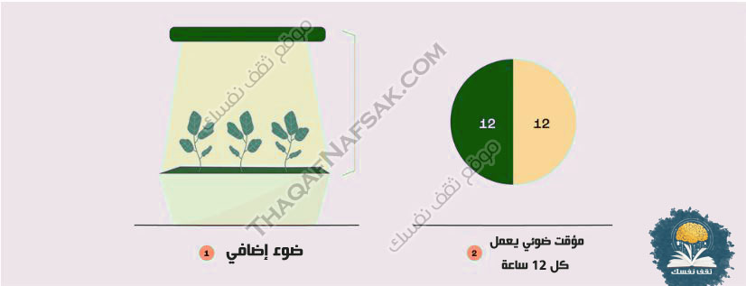 • ضوء إصطناعي للنمو، يكون ضوء قوي يعادل التعرض لأشعة الشمس المباشرة لمدة 5 ساعات أو أكثر.