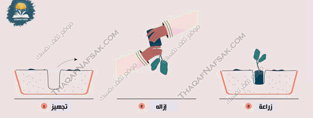 - ضع الشتلة في الحاوية النهائية واملأ حولها بالتربة بحيث تكون محكمة الإغلاق لكنها غير مضغوطة .