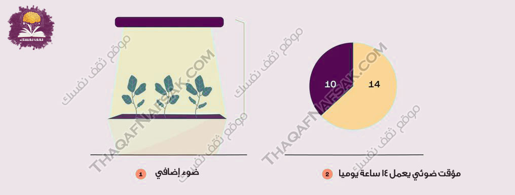 تعرف نباتات الزنجبيل باسم ” النهار القصير ” مما يعني إنها ستحول جهودها إلى صنع البذور إذا شعرت بالظلام لمدة تزيد من 12 ساعة . نريد الاحتفاظ بها في مرحلة مبكرة حتى نتمكن من الاستمرار في حصاد الأوراق . لذلك نوصي باعداد مؤقت لتركها لمدة 14 ساعة على الأقل يومياً .