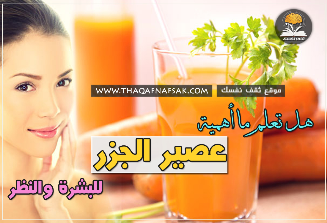 عصير الجزر للبشرة والنظر منخفض السعرات الحرارية و يقدم العديد من الفوائد الصحية الهامة للجسم و البشرة و العينين. تناول العصير بانتظام على تحسين صحة الرؤية و تقليل خطر الإصابة بالسرطان و تعزيز جهاز المناعة و تنظيم مستويات ضغط الدم و مستويات الكوليسترول. كما أنه يحتوي على الألياف و المعادن و الفيتامينات المفيدة للجسم و لصحة الجهاز الهضمي.