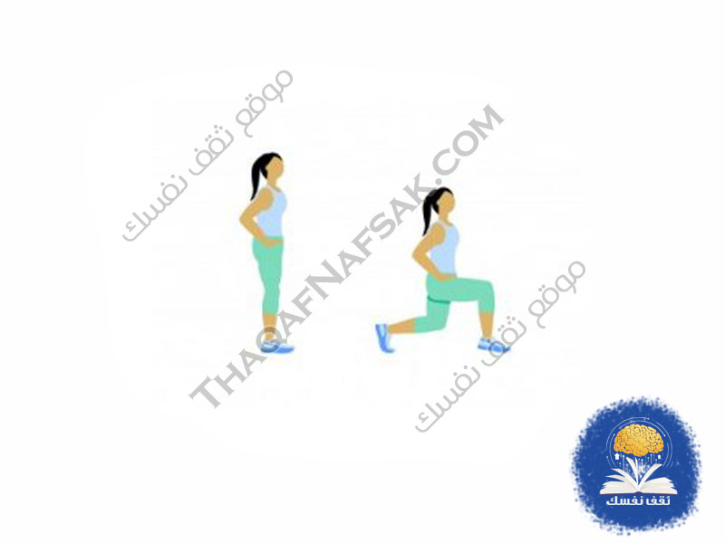الوقوف مستقيماً وضم القدمين معاً ثم أخذ خطوة كبيرة إلي الامام بساقك اليمني والنزول بالجسم حتي تصبح القدم اليسرى في الخلف وتأخذ القدمين زاوية 90 درجة والثبات لمدة 30 ثانية ثم العودة مرة أخري الي نقطة البداية والتكرار مع الجانب الأخر لتبديل بين الساقين.
