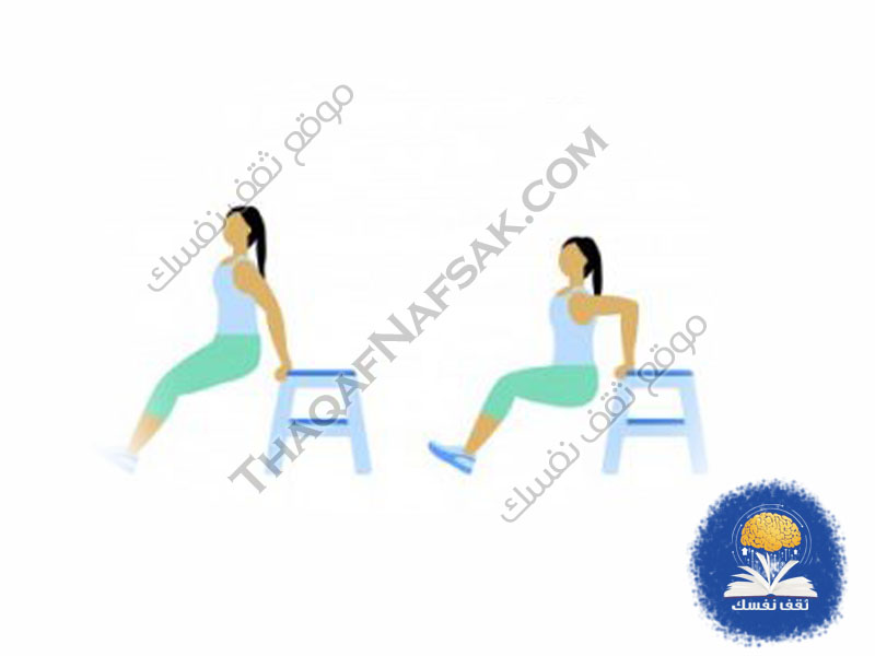 وضع كرسي بجوارك للجلوس علي طرف الكرسي وأثناء النزول إلي أسفل يمكنك تثبيت الكفين علي طرف الكرسي والقدمين مفرودة امامك واتجاه أصابع القدمي مفرود إلي الأعلى وتقدم الدعم لوزن الجسم من خلال الاتكاء علي الكعبين ثم القيام بانحناء الذراعين حتي تأخذ زاوية 90 درجة ببطء للنزول نحو الأسفل. يمكن القيام بالتمرين لمدة 30 ثانية ثم الضغط علي الكرسي للعودة إلي وضعية البداية.