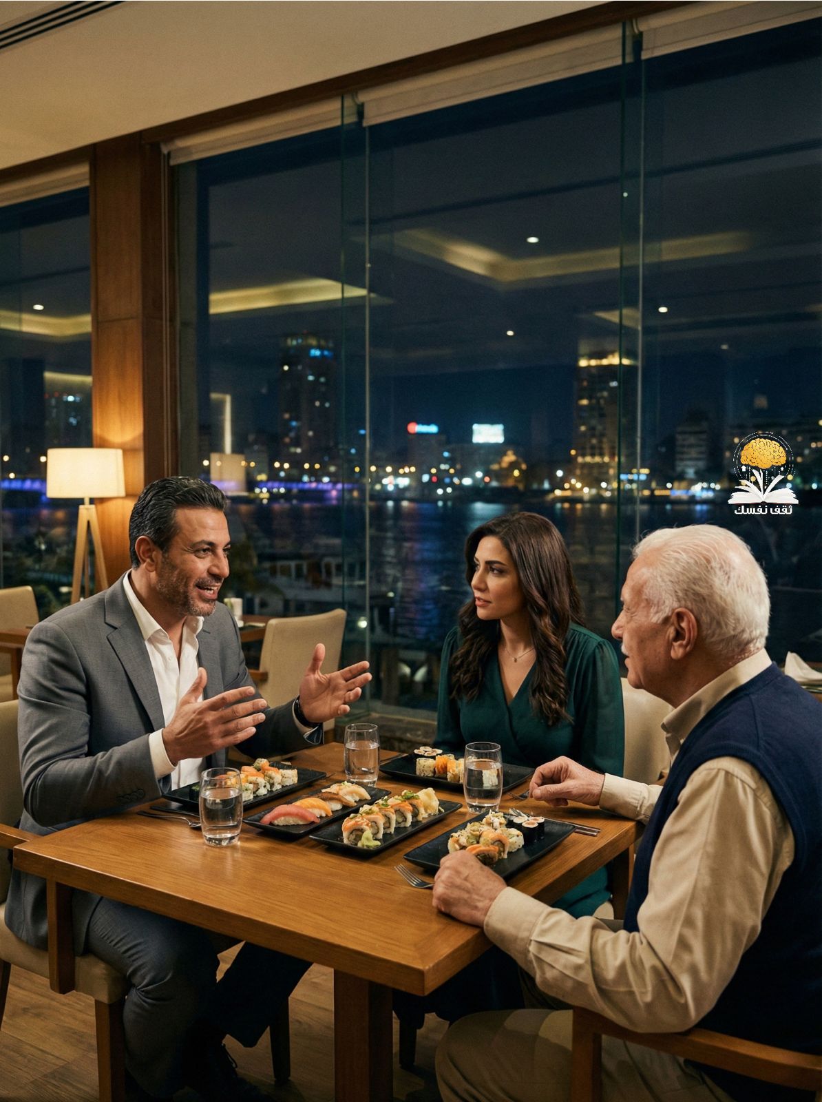 يوم العزومة، لبست الفستان الكحلي اللي هو اختاره، وبقيت شبه زوجات المجتمع الراقي اللي دورهم يبتسموا ويسكتوا. وصلنا المطعم وكان “تاناكا” موجود.. راجل وقور جداً. المفاجأة إن تاناكا كلمني بإنجليزي سليم ومحترم جداً في الأول، بس بمجرد ما الأكل نزل، حازم حول الدفة للياباني عشان يستعرض عضلاته.