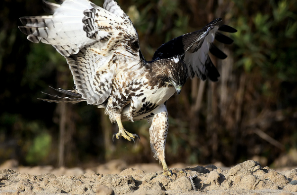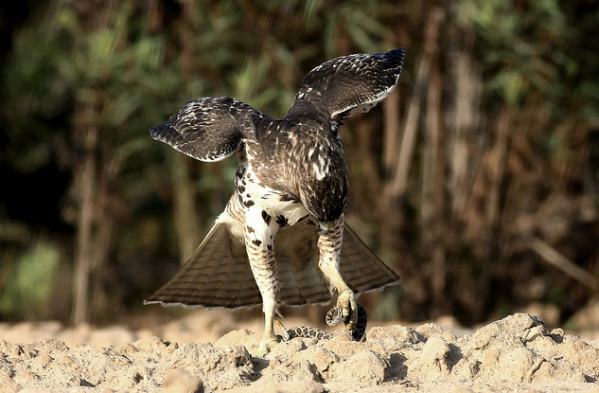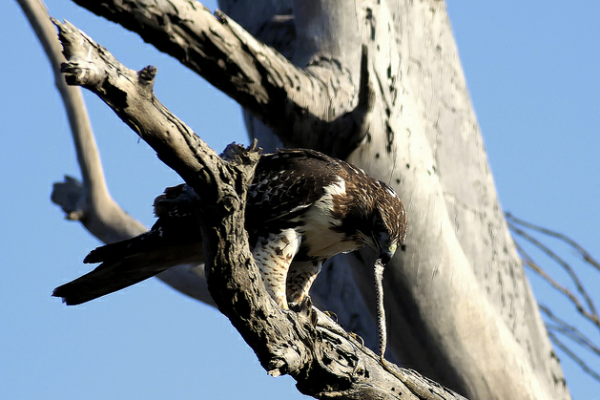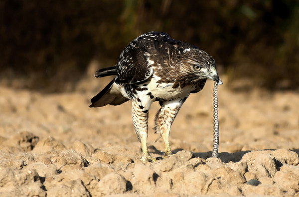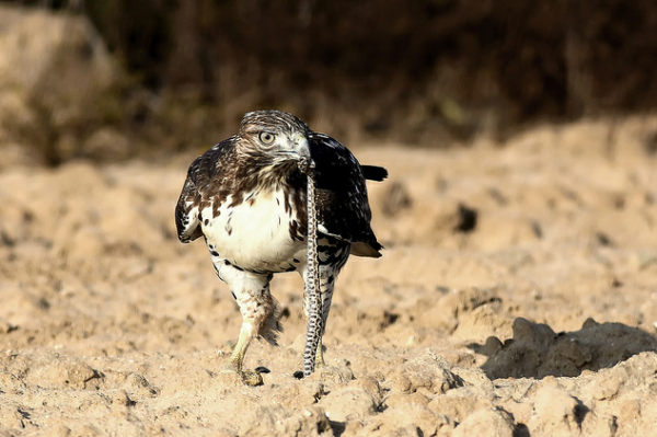 الطائر هو صقر احمر الذيل وهو اكثر انواع الصقور شهرة في امريكا الشمالية الافعى يبدو انها من الافاعي المجلجلة