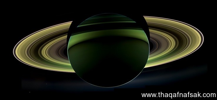 في هذه الصورة تم إلتقاط ظلال كوكب زحل عندما كانت الشمس تقع خلفه ولأن الأرض تقع في الطريق بين الشمس وزحل لا يمكننا إلتقاط مثل هذه الصورة بدون أن تكون هناك سفينة فضائية خارج الأرض والتي قامت بتصويره