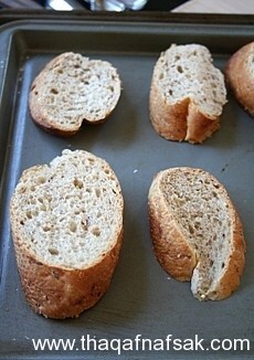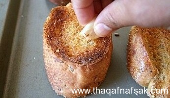 – إخراج الخبز من الفرن , مع الإحتفاظ بالخبز المحمص دافئاً قليلاً . قم بفرك الثوم علي الخبز فهو يعطي رائحة شهية .