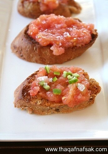 – قم بإضافة الطماطم بإستخدام المعلقة علي الخبز.