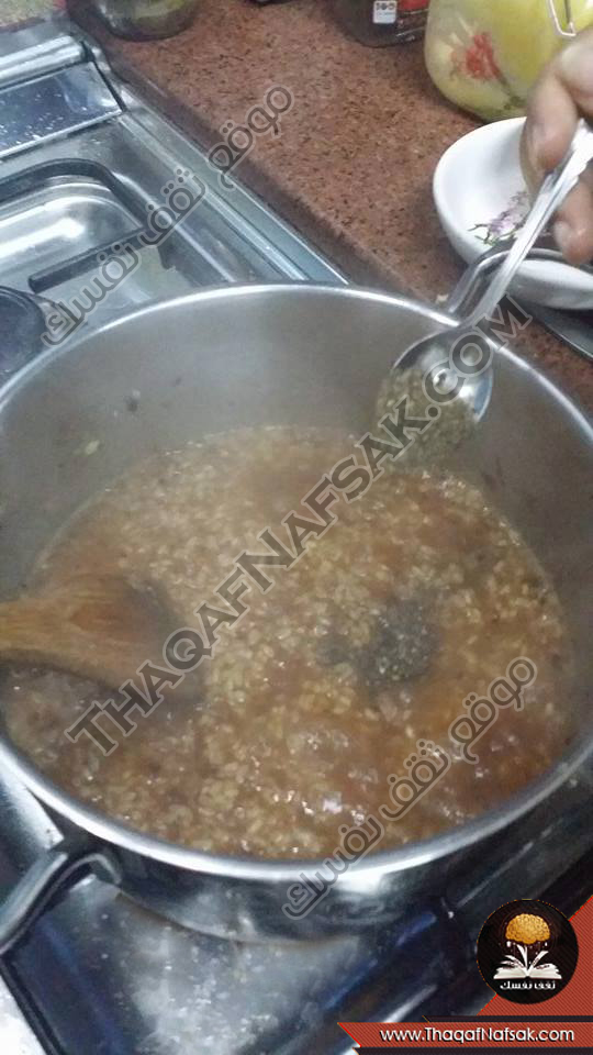 6- ثم ضعي نصف كمية الماء ، وعندما تصل للغليان ويمتصها الأرز قومي بوضع الجزء المتبقي من الماء علي الأرز والتقليب جيدا