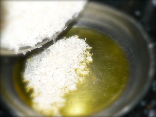 جهزي مقلاة منفصلة ، سخني السمن و قلي الأرز لمدة 2 دقيقة حتي تغلف السمن الأرز تماماً .