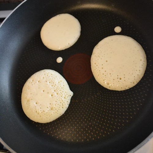 سخني مقلاة تيفال ( غير قابلة للاصق ) علي درجة حرارة خفيفة و إبدأي بصب خليط علي شكل دوائر صغيرة .