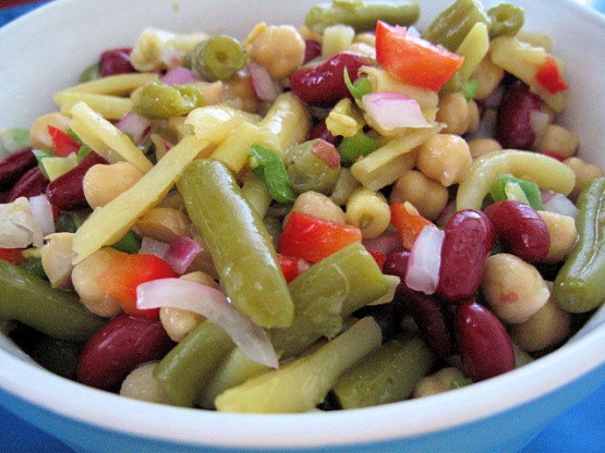 قم بسلق الفاصوليا الخضراء المقطعة مع الفاصوليا الحمراء والفاصوليا السوداء حتى تصبح قابلة للأكل وقم بتقطيع البصل الأحمر واالفلفل الأخضر واخلطهم مع الفاصوليا مع القليل من الملح والفلفل وزيت الزيتون ثم ضعها في الثلاجة