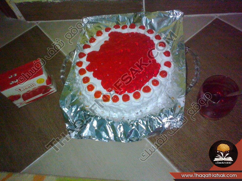 نحضر الجيلى وذلك بغلى كوب من الماء ووضع باكو الجيلى فيه وعندما يبرد قليلا نضعة فى الثلاجة لمدة 5 دقائق ثم نقوم بتوزيع الجيلى على الوجه باستخدام المعلقة بشكل متساو ثم نقوم بوضع التورتة فى الثلاجة مرة اخرى.