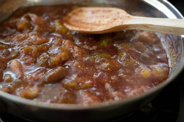 ترك المقلاة علي النار حتي يتم طهي التين وبعد مرور 4 – 5 دقائق يتم وضع مسحوق القرفة وعصير الليمون والسكر مع التقليب جيداً .