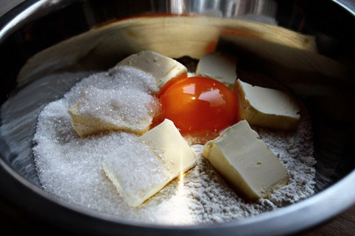 - أولاً، نبدأ بإستخدام الطحين والزبدة وصفار البيض و 2 ملاعق من السكر .