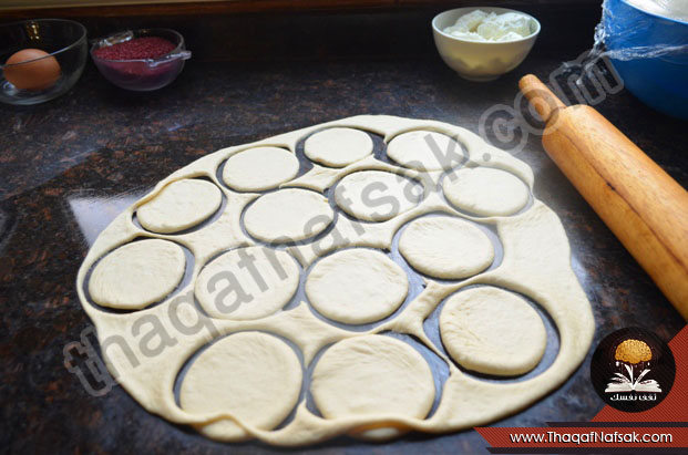 تقطيع العجين الى دوائر اضافة الجبن الشيدر الى العجين -