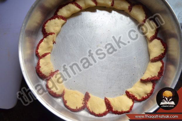 وضع العجينه في الصينية واكمال اول دائرة بنفس الطريقة ووضع انصاف الدوائر فوق بعضها البعض.